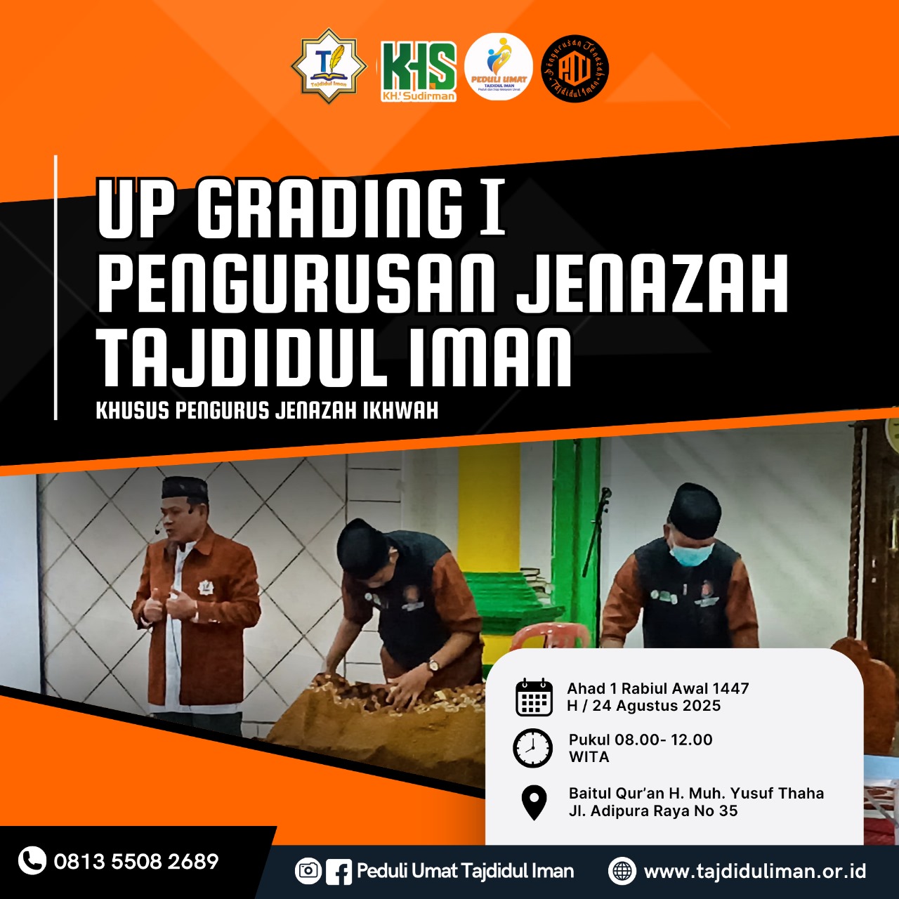 Pengurus Jenazah Tajdidul Iman (PJTI) yang dibina langsung salah satu ulama Muhammadiyah kota Makassar, KH Sudirman, bakal menggelar kegiatan UP GRADING I atau pelatihan peningkatan kualitas (upgrade) pertama bagi para anggota PJTI.